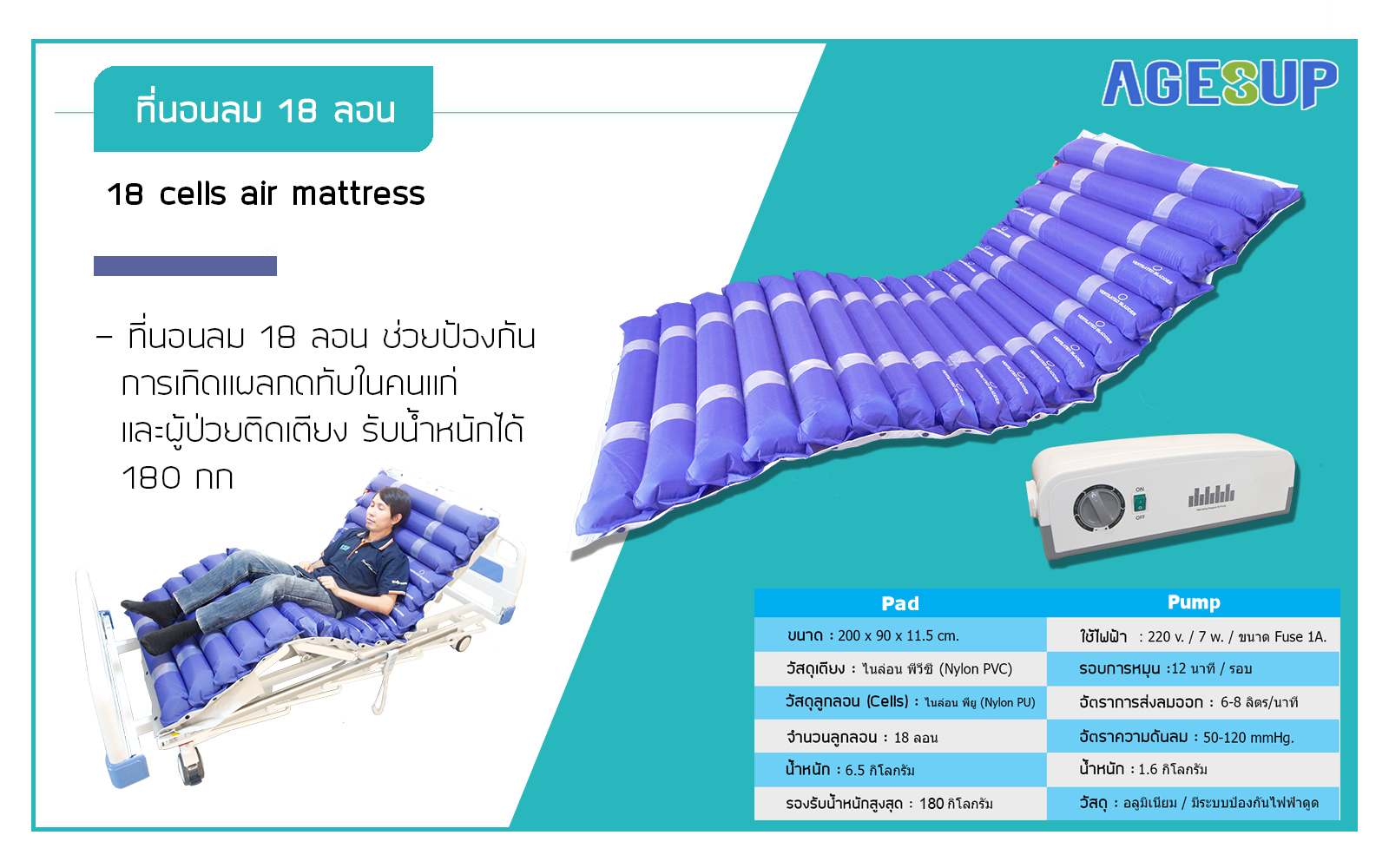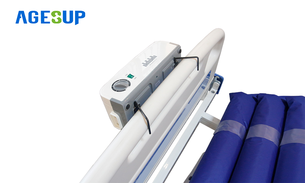 - ตัวปั้มสามารถแขวนกับขอบเตียงหรือหัวท้ายเตียงที่นอนผู้ป่วยได้