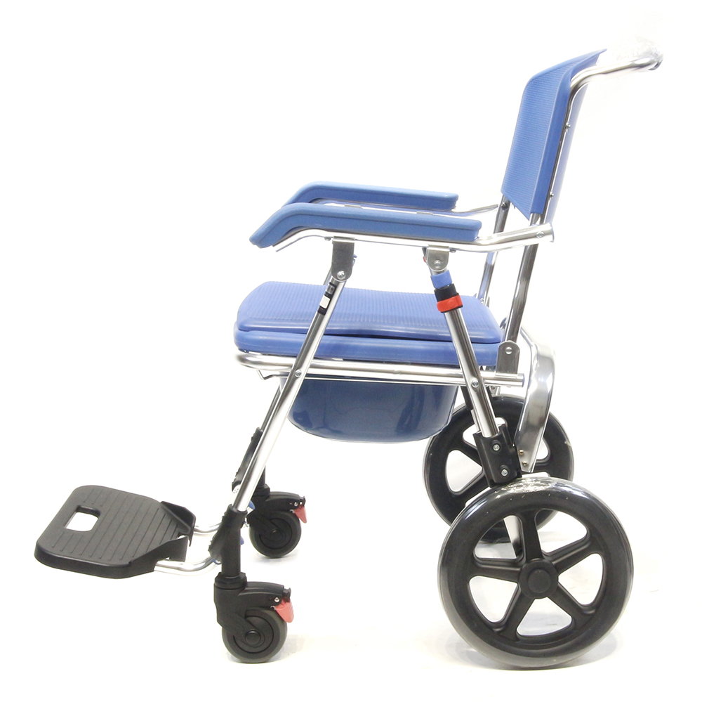 รถเข็นนั่งถ่ายโครงสร้างทำมาจากอลูมิเนียม แข็งแรงทนทาน มีน้ำหนักเบา สามารถพับได้ พกพาได้สะดวกสบาย อาบน้ำได้ไม่เป็นสนิม และยังมีนั่งถ่ายในตัว หรือจะเข็นคร่อมชักโครกก็ทำได้ เบาะหนังนิ่มนั่งแล้วไม่เจ็บก้น และยังสามารถกันน้ำ ทำให้ทำวคามสะอาดได้ง่าย ตัวล็อครถเข็นกันไม่ให้พับหุบลงมาในขณะนั่งอยู่บนรถเข็น
