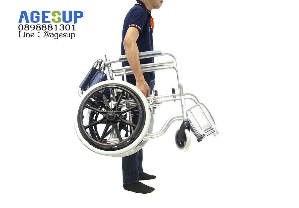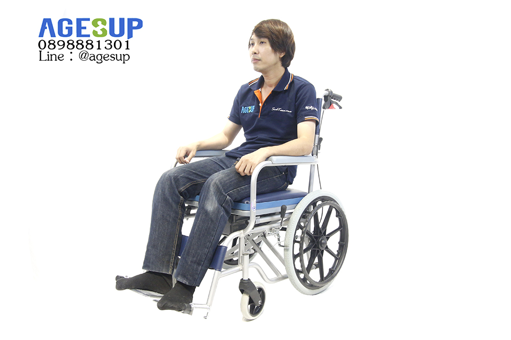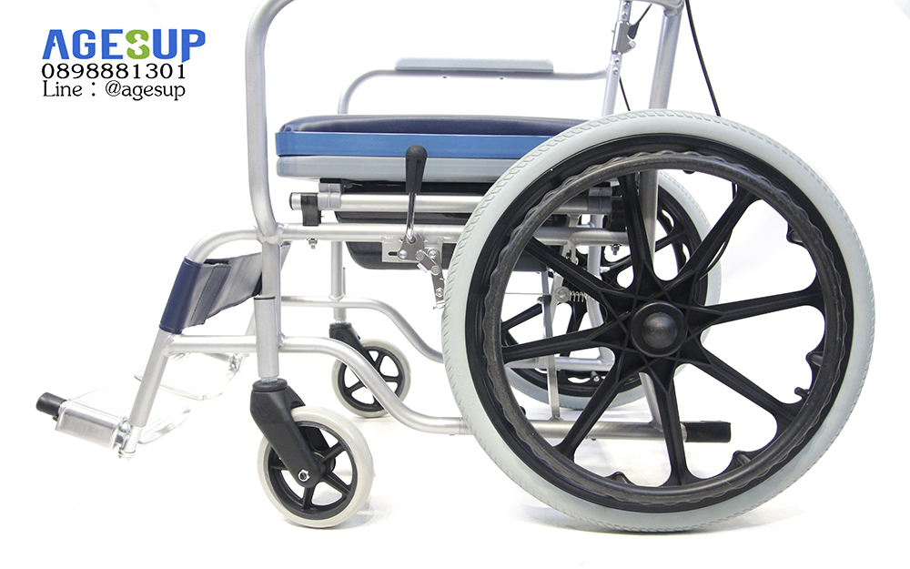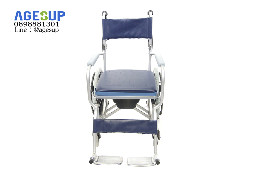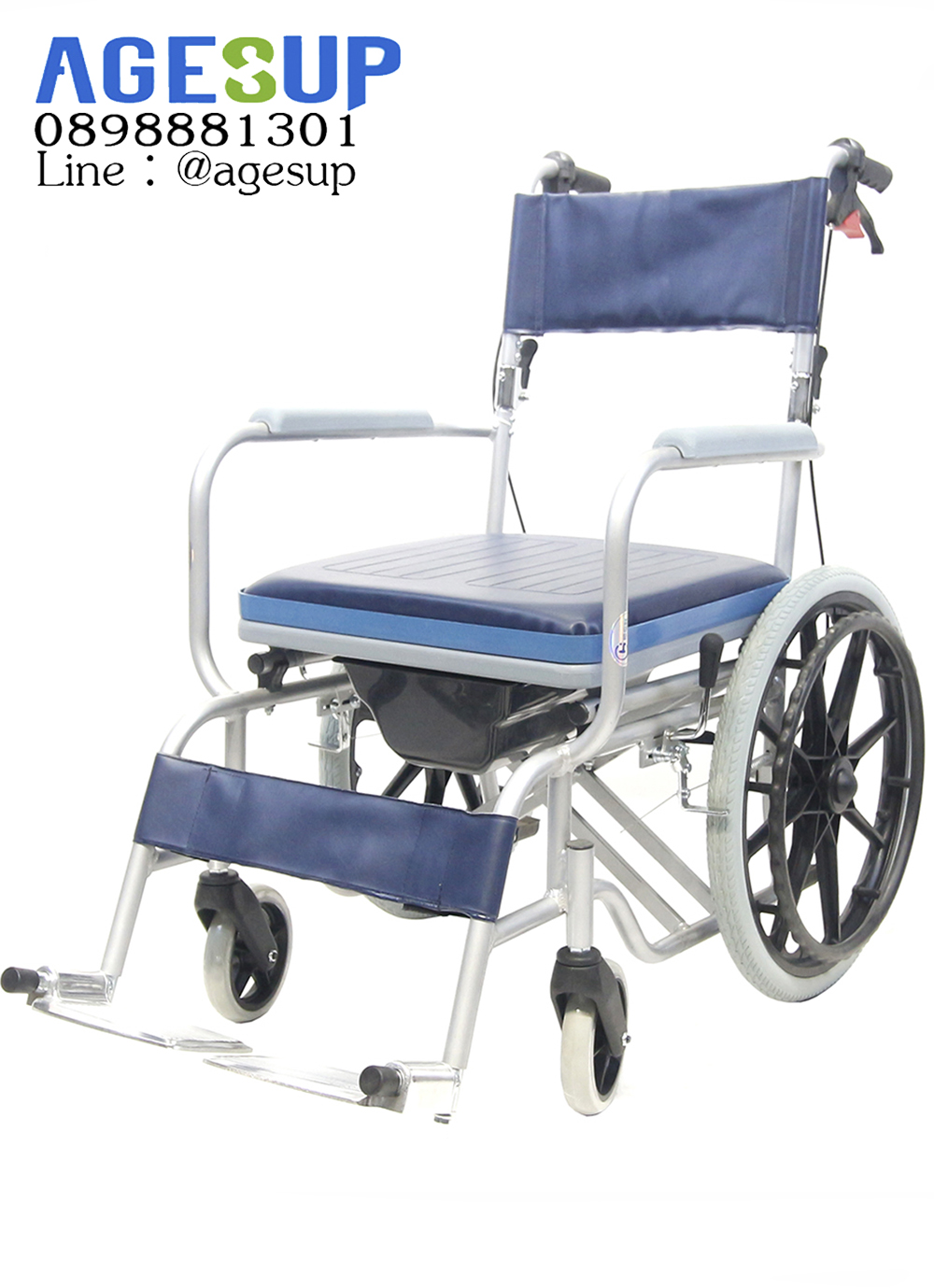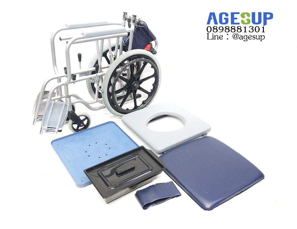 รถเข็นเก้าอี้นั่งถ่ายพับได้ โครงสร้างวัสดุทำมาจากอลูมิเนียม น้ำหนักเบา แข็งแรงทนทาน ที่พักแขนสามารถเอาขึ้น-ลงได้ เพื่อให้ง่ายต่อการเคลื่อนย้ายตัวผู้ป่วย ที่พักเท้าพับได้ พนักหลังถอดได้ เบาะนั่งทำจากฟองน้ำอัด ถอดล้างได้ง่าย มีถังนั่งถ่าย ล้อหน้าขนาด 6 นิ้ว ล้อหลังขนาด 20 นิ้ว (ยางสูบลม) ตัวรถเข็นนั่งถ่ายมีน้ำหนัก 14.59 กก. สามารถรับน้ำหนักได้ 100 กก.