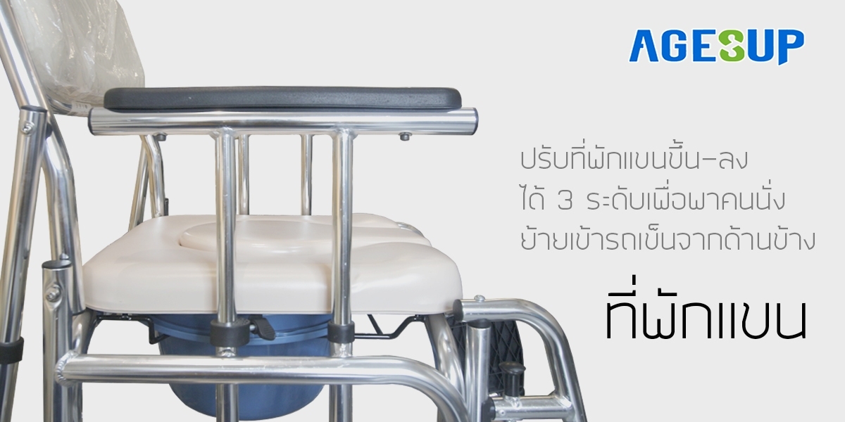ที่พักแขนสามารถปรับขึ้น-ลง ได้ 3 ระดับ เพื่อพาคนนั่งย้ายเข้ารถเข็นจากด้านข้าง
