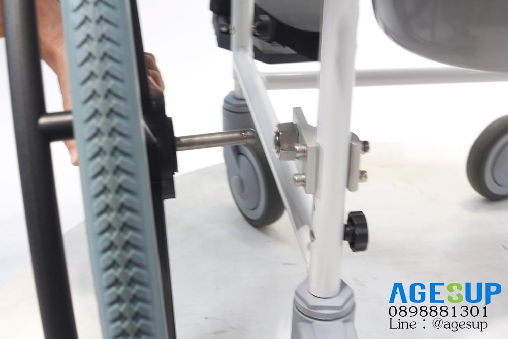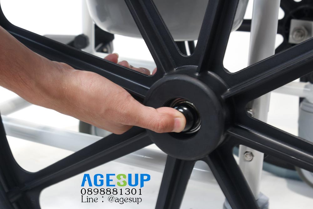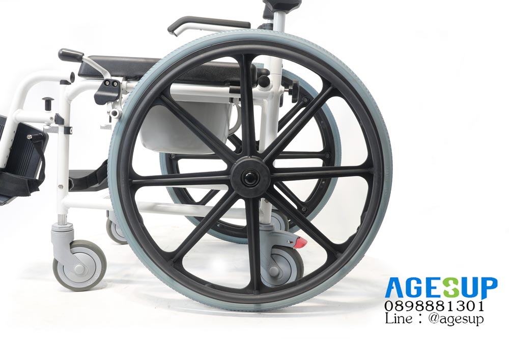 ตัวรถเข็นนั่งถ่ายสามารถเปลี่ยนเป็นล้อเล็กหรือล้อใหญ่ได้ ตามความสะดวกตามการใช้งาน