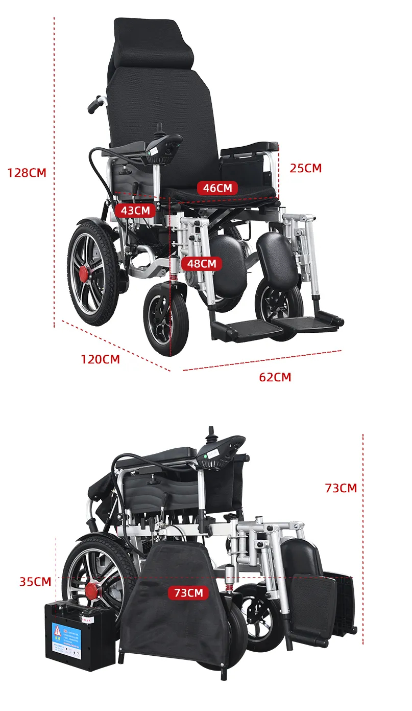 รถเข็นวีลแชร์ไฟฟ้าสามารถปรับเอนนอนได้ วัสดุทำมาจากอลูมิเนียม อัลลอย (Aluminum Alloy) ชนิดเดียวกับที่ใช้ทำเครื่องบินและกระสวยอวกาศ มีความหนา แข็งแรงทนทาน ล้อหลัง 18 นิ้วยางตัน มอเตอร์แบบคู่ใช้ขับเคลื่อนล้อหลัง มีล้อเสริมใช้ป้องกันเวลาวิ่งผ่านเนินหรือทางลาดขั้น รถเข็นน้ำหนัก 47 กก. รับน้ำหนักได้ 150 กก.