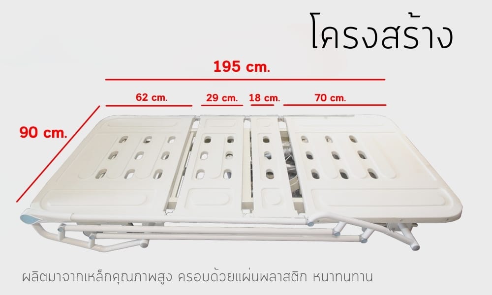 โครงสร้างเตียงทำจากเหล็กกล้า พ่นด้วยสีเคลือบแข็งด้วยกรรมวิธี Cold Rolled Steel และครอบด้วยพลาสติกเพิ่มความแข็งแรงทนทาน